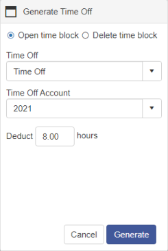 A dialog box will open giving you the option to open time block or to delete the time block. This block will also allow you to select the type of time off, which time off account to take the time off from and how many hours to deduct. After making your selection click Generate.